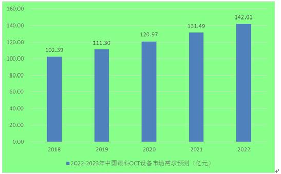 中国眼科OCT设备行业市场供需求规模已经达到了102.39亿元,并且每年以8%左右的增速增加,并且增加到2022年达到142.01亿元。