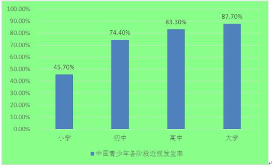 中国青少年学习时间长+户外活动少,近视高发。2018年PISA测试中,中国学生以平均每周学习57小时居于榜首,而在全球体育活动报告中,中国组织青少年户外活动情况和综合评价均居于榜尾。“学习时间长+户外活动少”造成中国青少年各阶段近视发生率不断上升,大学生近视率达到87.7%。