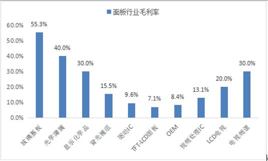 LCD产品价值链构成“微笑曲线”,即LCD产业链的毛利率呈现U型,左边高毛利率的是上游基础材料(40%以上毛利率),中间低毛利率的是中游面板制造(10-20%的毛利率),右边较高毛利率的是下游终端产品(毛利率20-30%)。
