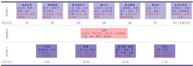 面板产业链上游主要包括液晶材料、玻璃基板、彩色滤光片、偏光片、背光模组、驱动IC、自动化设备,其成本构成占比分别为3%、9%、15%、10%、18%、3%、11%。下游应用主要来自广告机、电视、显示器、手机等产品。