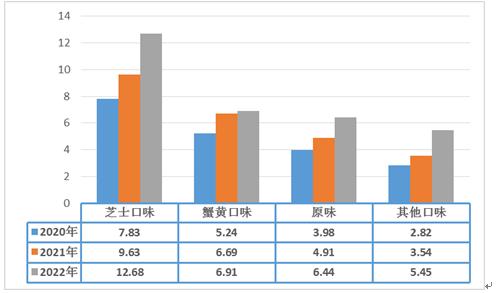 从细分市场来看,鳕鱼肠各细分口味市场增速相对较为平均,三类口感的鳕鱼肠产品在2020-2022年间的增速维持在30%之上;其它口感的鳕鱼肠增速相对较快,在50%以上。