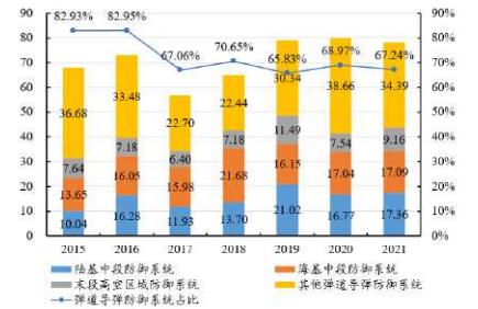 据OUSD,2015-2016年,弹道导弹防御系统(射程150-300公里,远程)预算维持在70亿美元左右,2017年,预算降至57亿美元,2017-2019年,预算自57亿美元升至79亿美元,2019-2021年,预算维持在80亿美元左右;2015-2016年,弹道导弹防御系统预算占比维持在83%左右,2017-2021年,预算占比维持在67%左右。