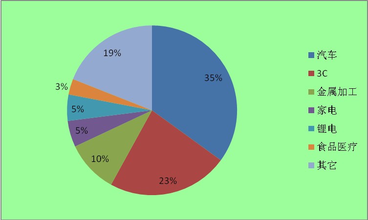 工业机器人的下游应用领域主要包括汽车、通用工业。其中,汽车行业作为自动化应用最早的行业,为工业机器人行业的主要下游市场。目前,汽车行业位居第一应用领域,占比达到35%。随着我国制造业的转型升级,工业机器人的应用领域逐渐的增多,工业机器人前景光明。