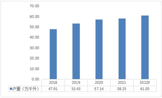 图表:2018-2022年国内酱香型白酒产量规模(单位:万千升)
