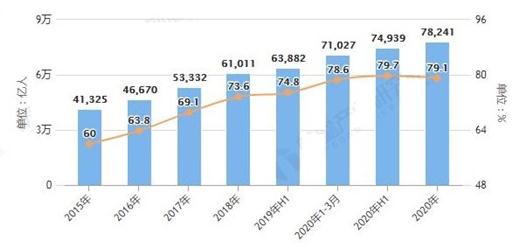 目前我国网络消费领域保持稳步增长,截至2020年12月,我国返利网站用户规模达到7.82亿,较2020年3月增长7215万,占网民整体的79.1%。2019年返利购物网站市场交易规模达10.63万亿元,占社会消费品零售总额比例逐年持续增长。