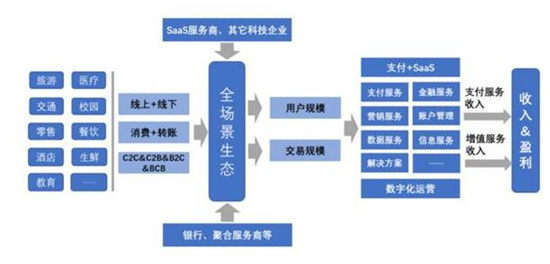 支付机构服务模式由多场景单一服务向全场景数字化运营转变。在互联网时代,移动支付具有极强的场景属性。各支付机构不断针对旅游、医疗、交通、校园等细分场景进行布局。随着大数据、人工智能等技术的发展,支付机构开始集成不同支付场景,将线上和线下支付结合,发展多元服务,同时引入SaaS服务商、银行、聚合服务商等外部机构,基于场景网络构建全场景数字化平台。例如快钱公司结合各类消费场景,运用前沿科技打造创新型金融科技平台,为企业和个人用户提供移动支付、定制化行业解决方案、金融云等金融科技服务,将金融科技辐射至更多产业和场景,从而赋能企业和用户。场景集成带来的协同效应会逐渐体现在支付机构的用户规模和交易规模上。当规模增长到一定程度时,依托于全场景数字化平台的支付服务和增值服务也能在收入上得到增长,提升支付机构盈利能力。