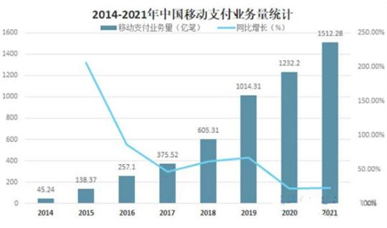 虽然我国移动支付产业起步较晚,但移动支付方式的创新速度及普及程度已经走在世界前列,随着以微信、支付宝为首的支付系统平台对移动支付功能的深入探索和大力推广,越来越多的人群开始接受和使用移动支付,2021年中国移动支付业务量达1512.28亿笔,较2020年增加了280.08亿笔,同比增长22.73%。