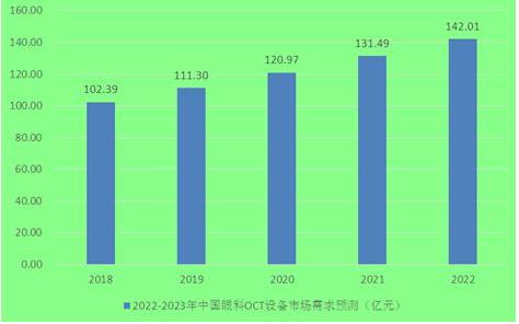 2018年中国眼科OCT设备行业市场供需求规模已经达到了102.39亿元,并且每年以8%左右的增速增加,并且增加到2022年达到142.01亿元。