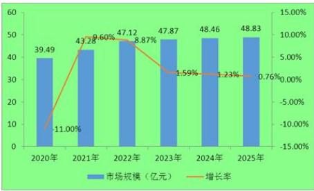 受疫情影响,预计2020年镍氢电池行业市场规模略有下降,为39.49亿元,随着疫情得到控制,镍氢电池行业逐步恢复生产。但是行业本身已经进入成熟阶段,未来几年将会维持低速增长,到2025年,行业市场规模约为48.83亿元。