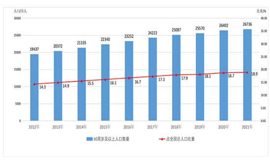 图表:2012年—2021年全国60周岁及以上老年人口数量及占全国总人口比重