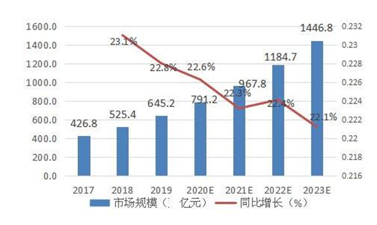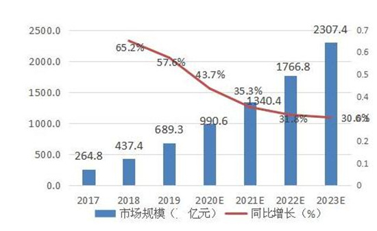云服务行业发展趋势及市场现状如何?受新冠疫情影响,线下面对面接触受到诸多限制,线上“非接触式”服务得到空前关注,互联网在线业务整体流量趋好。从细分赛道来看,办公管理类服务的使用时长上升显着,尤其以各类视频会议产品为典型;学习教育类产品的上升主要得益于各类校内与校外机构的远程教育培训需求;疫情期间的视频服务、智能穿戴、健康医疗等产品也获得了更多使用。总体而言,视频类服务作为现阶段数据流量消耗的重要场景,其不断攀升的需求将直接拉动市场对基础云资源的需求。未来几年中,云服务市场仍将处于高速发展状态,保持30%以上的年复合增长率。其中,公有云市场规模达到689亿元,相比2018年增长57.6%,预计2020-2022年仍将处于快速增长阶段,到2023年市场规模将超过2300亿元。私有云市场规模达645亿元,较2018年增长22.8%,预计未来几年将保持稳定增长,到2023年市场规模将接近1500亿元。