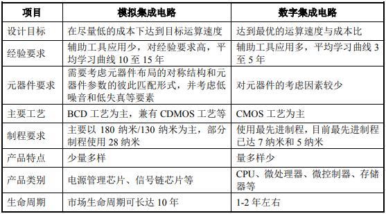 表:模拟集成电路和数字集成电路的主要对比