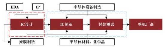 集成电路产业链的核心环节主要为集成电路设计、制造与封装测试三大环节。其中,集成电路设计处于产业链上游,集成电路制造为中游环节,集成电路封装测试为下游环节。