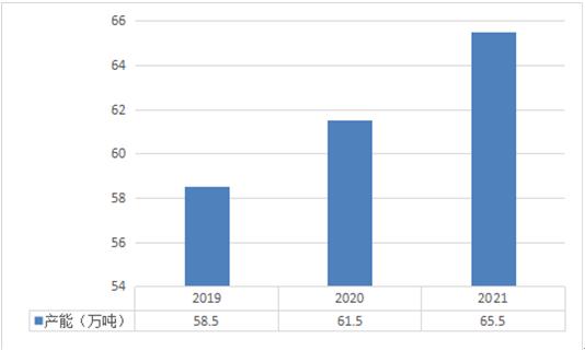 2019-2021年我国皮肤病药物产能不断增长,截止至2021年年底其产能规模达到了65.5万吨。
