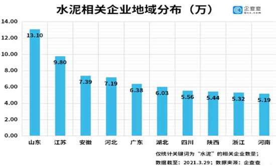 受需求带动,近日浙江、江苏、江西、福建、青海、甘肃等地水泥企业陆续发布涨价通知,A股水泥相关个股近期也集体走高。企查查数据显示,目前我国共有127.19万家水泥相关企业,山东省以13.1万家企业高居第一,江苏、安徽分列二三名,上海、天津、南宁则是排名前三的城市。2020年全年,水泥相关企业新注册28.49万家,同比增长42%,今年一季度新增企业7.49万家,同比增长112%。