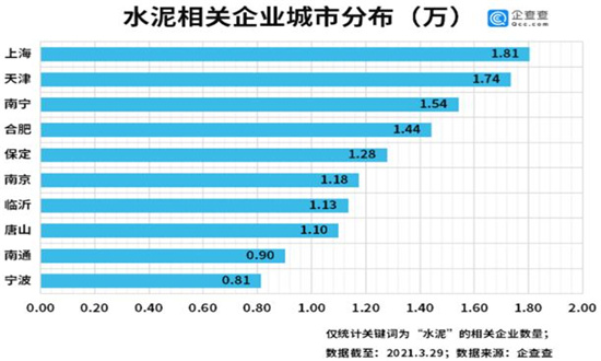 从城市分布来看,企查查数据显示,上海市的水泥相关企业数量最多,共1.81万家。天津、南宁、合肥和保定分别有1.74万家、1.54万家1.44万家和1.28万家,排名2-5位。