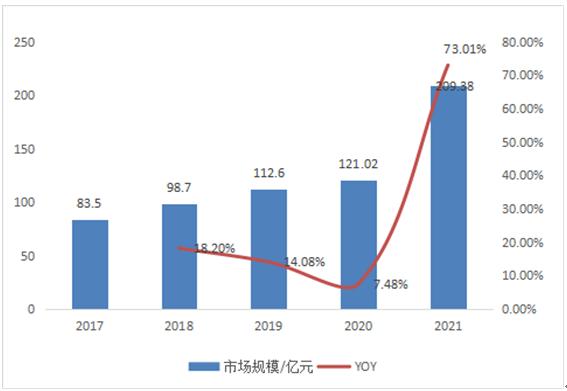 图表:2017-2021年国内射频元器件行业规模