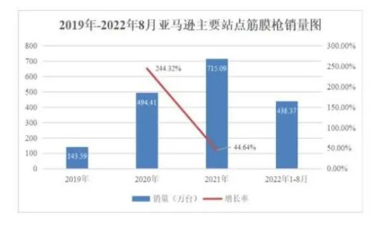 筋膜枪在国际市场也颇受欢迎,2019年至2021年,亚马逊6大主要站点筋膜枪产品的年销量分别为143.59万台、494.41万台和715.09万台,2020年和2021年的增幅分别为244.32%和44.64%。