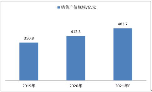 图表:2019-2021年中国训练健身器材行业总产值规模情况
