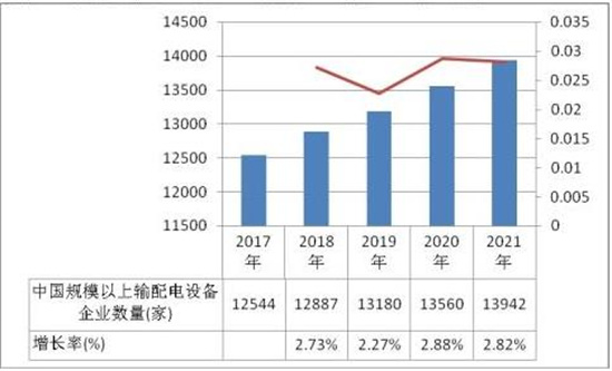 图表:中国规模以上输配电设备企业数量及增长情况