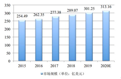 2019 年全球纸手袋市场规模为 301.25 亿美元,近来 5 年间全球纸袋即纸质软包装占比在 12%左右,市场保持高速增长的状态,由此预计至 2020 年将达到 313.16 亿美元。