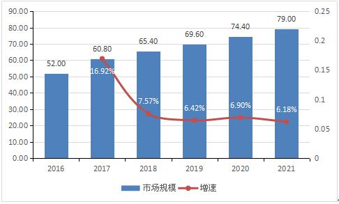 2017-2021年国内玻璃水市场规模呈现出较快的增长,由2017年的60.80亿元增长至2021年年底的79亿元,年均增长率达6.18%,高于机动车保有量的增长速度。