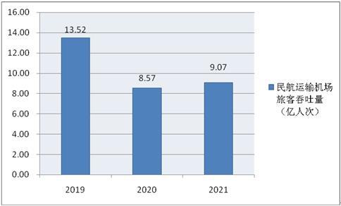 图表:2019-2021年中国民航运输机场旅客吞吐量(单位:亿人次)