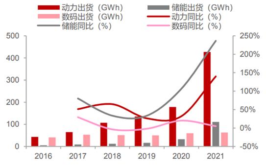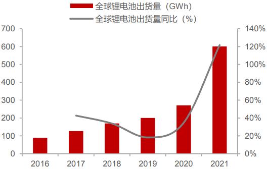 图表:2016-2021年全球锂电池行业出货量情况