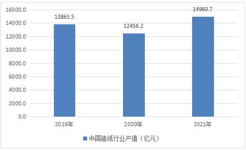 2019年中国造纸行业产值为13863.5亿元,2020年产值为12456.2亿元,2021年产值为14960.7亿元。