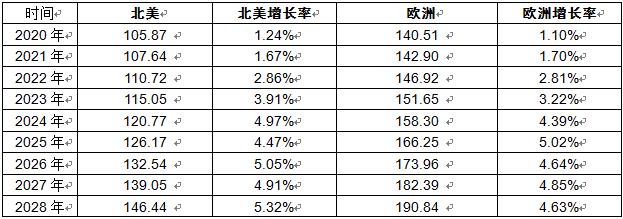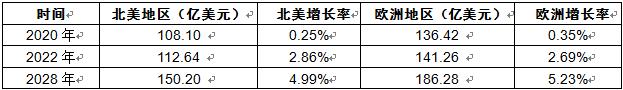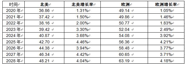 LED照明产品是世界各国节能照明重点推广产品,预计2028年北美地区的市场规模达到150.20亿美元,同比增长4.99%,2028年欧洲地区的市场规模达到186.28亿美元,同比增长5.23%。