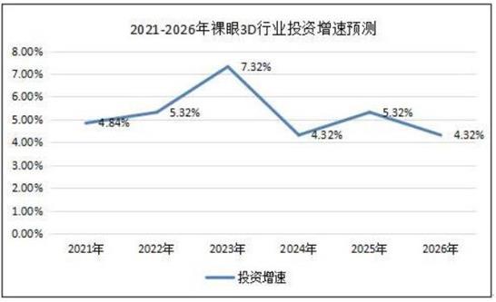 预测2021年裸眼3D行业投资增速为4.84%,2026年裸眼3D行业增速为4.32%,预测2021-2026年裸眼3D行业投资增速在5%左右。