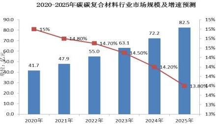 图表:2021-2025年碳碳复合材料行业市场规模及增速预测