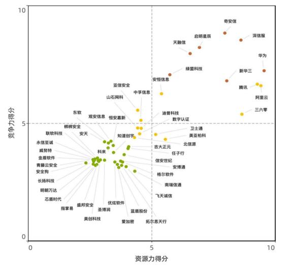 从整体来看,右上角头部企业竞争格局变化不大,头部企业在网络安全领域运营多年,有较强的竞争壁垒。但是厂商之间的竞争依然较激烈。奇安信借助强大的资本与资源的投入迅速成为领导者头部厂商。另外,可以看到头部企业与左下角的与中小型厂商进一步拉开差距。安恒信息、中孚信息凭借良好的业绩表现,竞争力显著提升。IT龙头企业与互联网公司不断加大安全领域的投入,进入网络安全市场,竞争力也有明显提升。