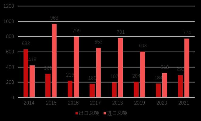 珠宝首饰制造行业前景投资如何?数据显示,珠宝行业进口总额为774.17亿美元,同比增长143.9%;出口总额为293.34亿美元,同比增长59.1%。整体来看,受上一年低基数影响,2021年进口额和出口额均实现高位数增长,同比也分别增长28.5%和43.6%