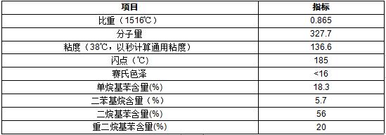 一般重烷基苯的平均分子量在300~350之间;其中单烷基苯(15%~20%)和二烷基苯(55%~60%)含量较高,两者共占(70%~80%)左右,另外还含有二苯烷、多苯烷、苟满和蔡满(20%~30%)。