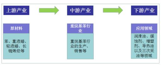 重烷基苯行业的上游是苯、重液蜡、轻液蜡、长链烯烃;下游行业是润滑油、缓蚀剂、增塑剂、导热油以及三次采油等领域。