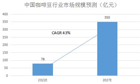 就中国咖啡消费结构的明显变化而言,中国新一代消费结构的稳步增长为中国咖啡消费的稳步增长做出了贡献。过去几年间我国咖啡豆行业市场规模快速增长,年复合增长率达30%以上,未来随着我国人均消费水平进一步提高以及咖啡在软饮料行业中市场渗透率持续提高,预计2022-2027年,中国咖啡豆行业市场规模将以43%的年复合增长率增长,预计至2027年底,行业市场规模有望增长至为350亿元。