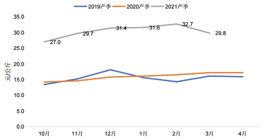 图表:2019-2021年产季云南咖啡豆市场综合评价均价格情况