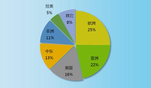 全球建筑工程地区市场业务规模方面,欧洲市场超过亚洲市场占据首位,占营业总额的25%;亚洲市场排第二位,占营业总额的22%;其次是美国市场、中东市场、非洲市场、拉美市场,占比分别为16%、13%、11%、5%。