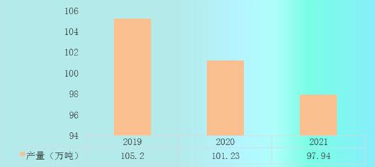 2019-2021年中国奶粉产量由105.2万吨下降到97.94万吨。