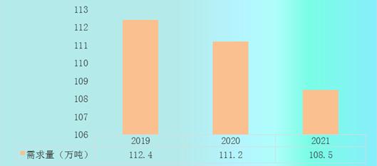 2019-2021年我国奶粉需求量由112.4万吨下降到108.5万吨。