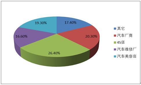 汽车贴膜重点需求客户主要有汽车厂商、4S店、汽车维修厂,汽车用品店、汽车美容店、汽车俱乐部等。汽车4S店是需求量最大的地方,占比约26.4%,其次为汽车厂商,占比约为20.3%。