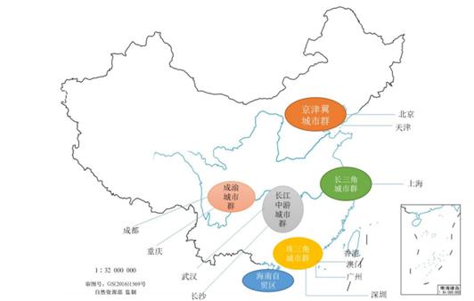 以上海为中心引领长三角城市群发展,带动长江经济带发展。以香港、澳门、广州、深圳为中心引领粤港澳大湾区建设,带动珠江-西江经济带创新绿色发展。以重庆、成都、武汉、郑州、西安等为中心,引领成渝、长江中游、中原、关中平原等城市群发展,带动相关板块融合发展。加强“一带一路”建设、京津冀协同发展、长江经济带发展、粤港澳大湾区建设等重大战略的协调对接,推动各区域合作联动。