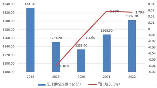 图表:2018-2022年全球方便面市场供给规模
