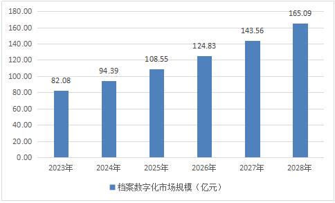 预测2023年档案数字化市场规模为82.08亿元,至2028年市场规模增至165.09亿元,年均增长率达到14%。