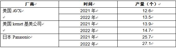 2022年美国AVX、美国kemet基美公司、日本Panasonic钽电容器产量分别为13.5、14.7、27.1亿个。