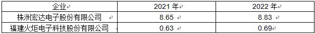 在高端电容器市场,特别是在军工领域具有明显竞争优势,2022年株洲宏达电子股份有限公司产值8.83亿元,福建火炬电子科技股份有限公司产值为0.69亿元。