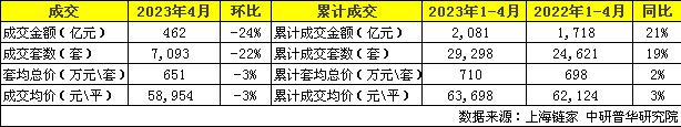 5月5日,据上海链家研究院的监控数据显示,4月份,上海全市共成交新建商品房7093套,环比下降22%,成交金额462亿元,环比下降24%,套均总价651万元,环比下降3%,成交均价58954元/平方米,环比下降3%。综合今年前4个月数据,上海全市新建商品房累计成交金额2081亿元,同比增长21%,成交套数29298套,同比增长19%,套均总价710万元/套,同比增长2%,成交均价63698元/平方米,同比增长3%。