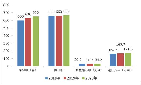 煤炭机电设备产量方面,采煤机与掘进机,刮板输送机和液压支架整体呈上升趋势,2018年我国采煤机与掘进机,刮板输送机和液压支架产量分别为600台、658台、29.2万吨、162.6万吨。2019年分别为630台、660台、30.7万吨、167.7万吨,均略有上升。截止2020年末,国内采煤机与掘进机,刮板输送机和液压支架产量分别为650台、668台、31.2万吨、171.5万吨。