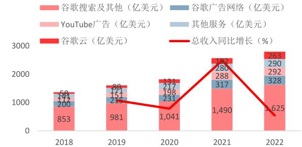 谷歌收入持续增长。根据谷歌最新的财务报告,谷歌2022年的年收入为2828.4亿美元,同比增长9.78%。其中,谷歌搜索及其他业务营收为1624.5亿美元,Network营收为327.8亿美元,YouTube广告营收为292.4亿美元,谷歌云收入为262.8亿美元,包括谷歌地图、谷歌硬件等业务的谷歌其他服务收入为290.1亿美元。2018-2022年,谷歌搜索及其他业务总收入占比下降,云业务占比上升,主要是因为谷歌云业务投入持续加大,业务仍处于扩张阶段;而搜索及其他业务受到疫情冲击广告投放减少,同时疫情结束后宏观经济环境下行所致。